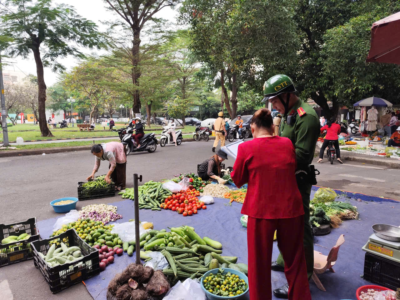 Lúc 7 giờ, lực lượng chức năng phát hiện nhiều người dân bày bán rau củ, trái cây xuống lòng đường. Ngoài ra, rất nhiều xe máy do người bán, người mua dựng tràn lan dưới lòng đường gây cản trở giao thông, tiềm ẩn nguy cơ tai nạn.