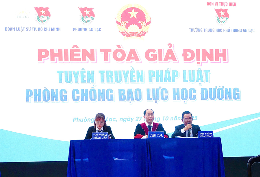 Sáng ngày 27/10/2025, không khí tại Trường THPT An Lạc, TP.HCM trở nên khác lạ. Thay vì những tiết học quen thuộc, sân trường hôm nay trở thành “phòng xử án đặc biệt” – nơi học sinh được chứng kiến một phiên tòa giả định do Đoàn Thanh niên Đoàn Luật sư TP.HCM phối hợp tổ chức, với chủ đề “Pháp luật học đường – Nói không với bạo lực”.