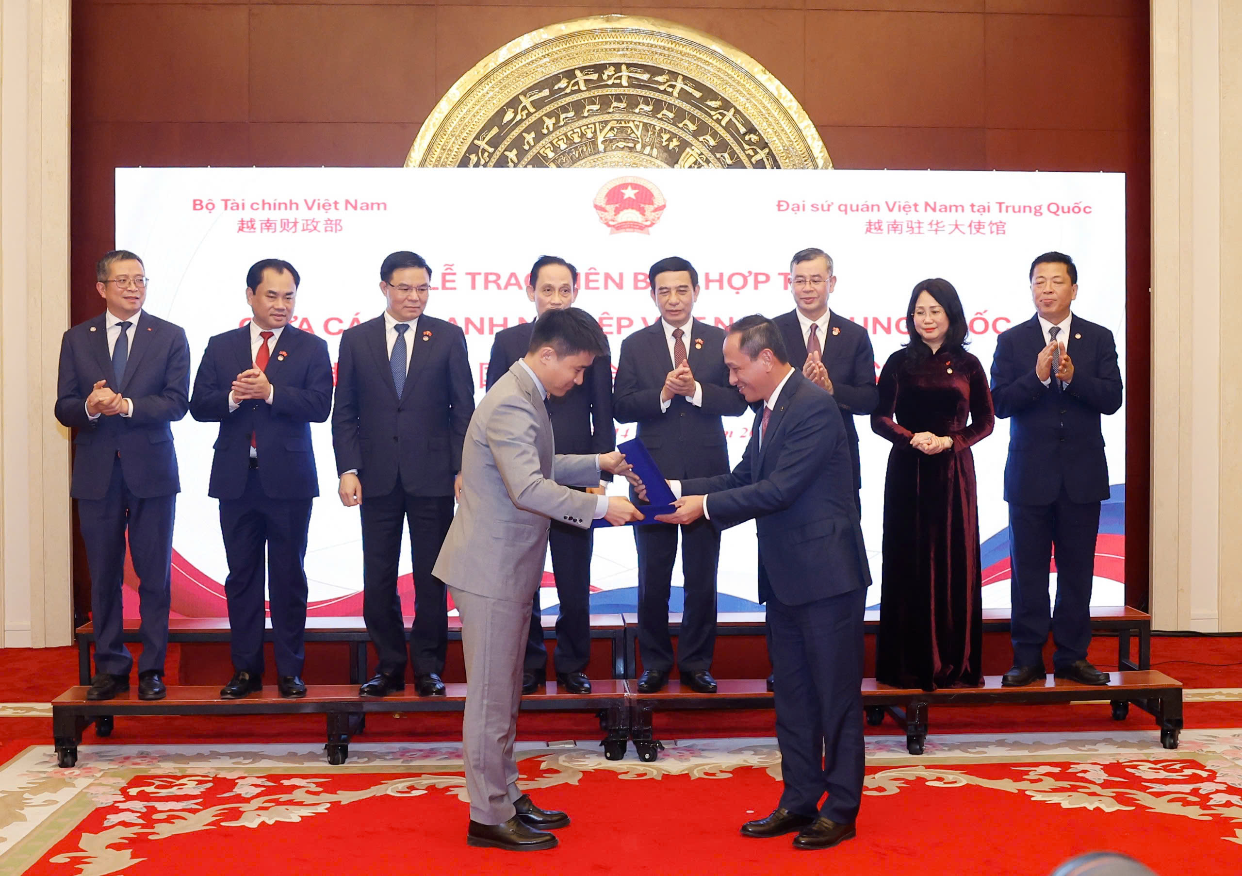 Tổng giám đốc Vietnam Airlines Lê Hồng Hà trao biên bản ghi nhớ giá trị khoảng 20 triệu USD đề thúc đẩy trao đổi khách hai chiều Việt Nam và Trung Quốc với Chủ tịch Beijing Shuozoujiuzou Technology Co., Ltd Hu Yangyang